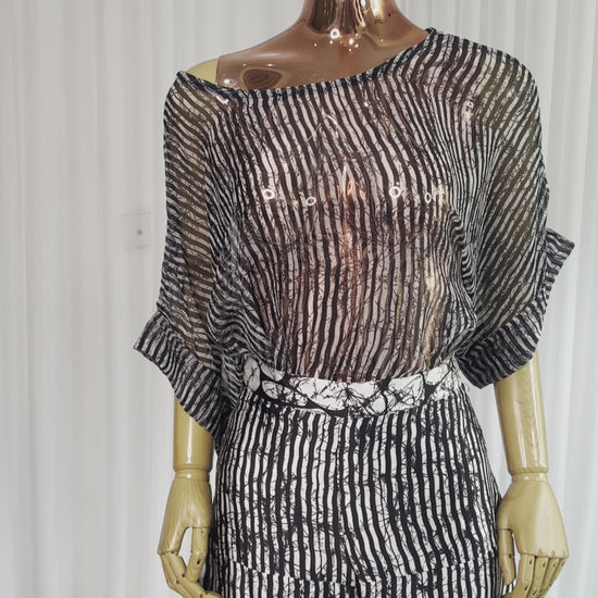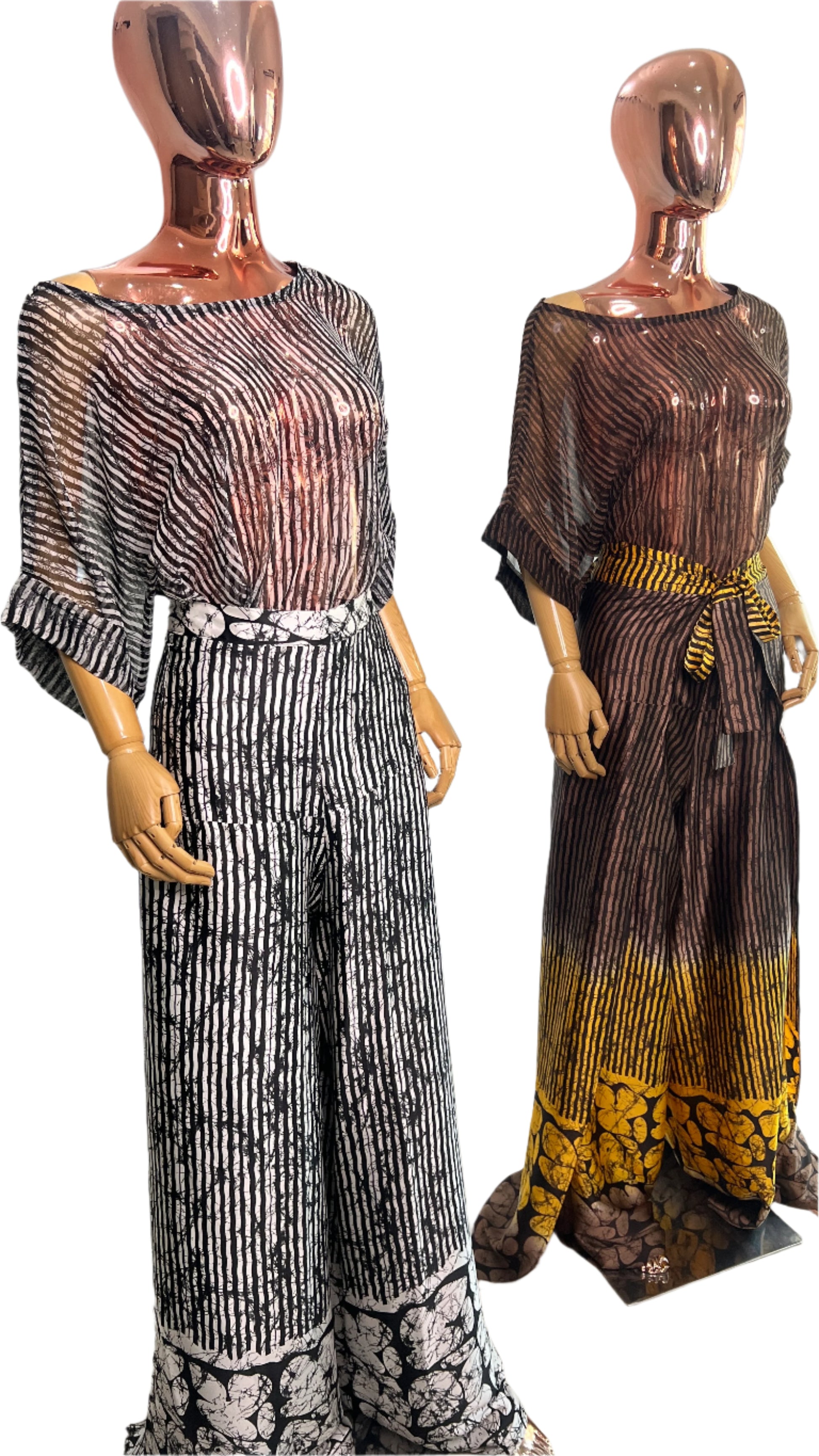 Silk pant set with Chiffon Top. It can be styled in different ways, you can dress it up with high heels or dress down with flats/sneakers.