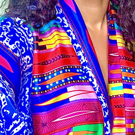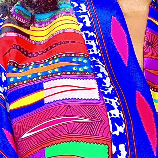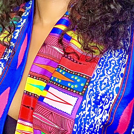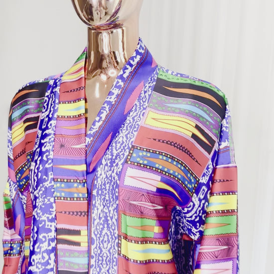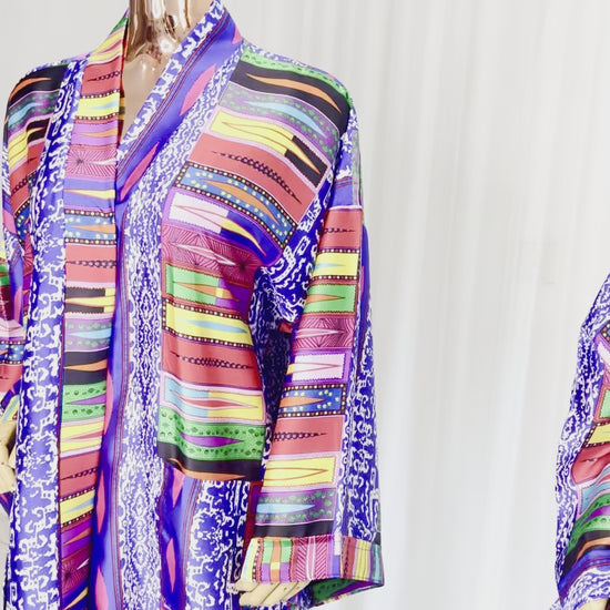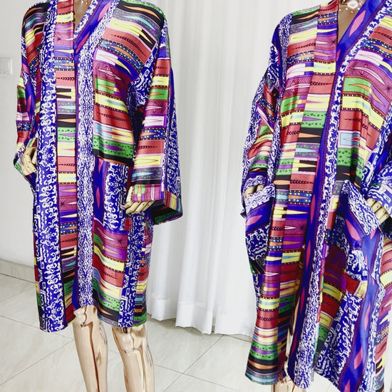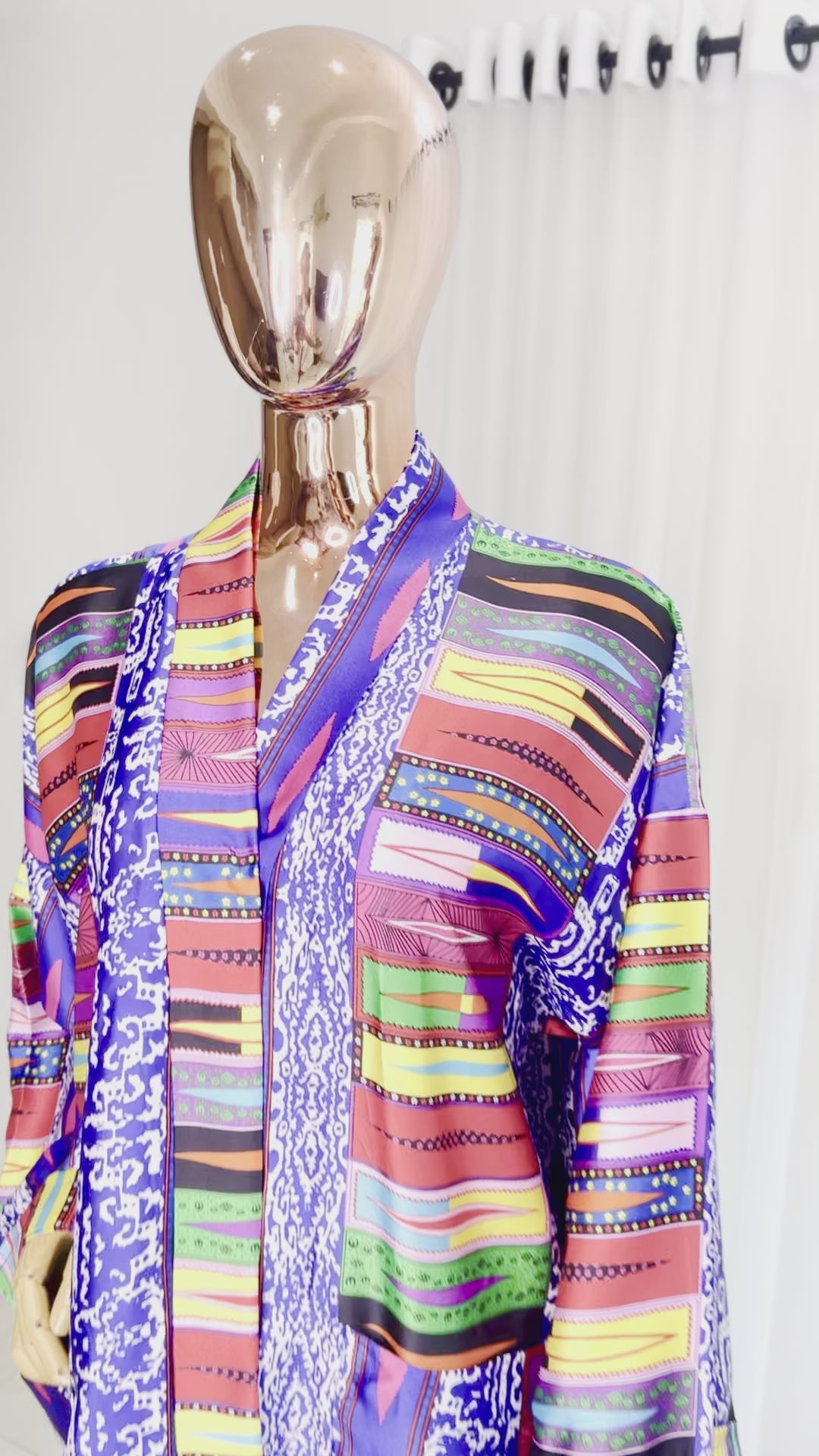 Designer silk print Kimono. It can be styled in different ways, you can dress it up with high heels or dress down with flats/sneakers.